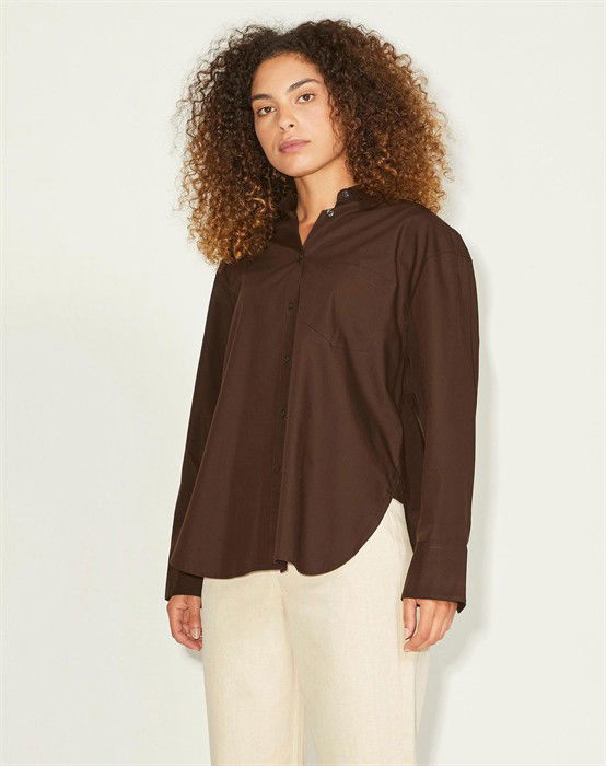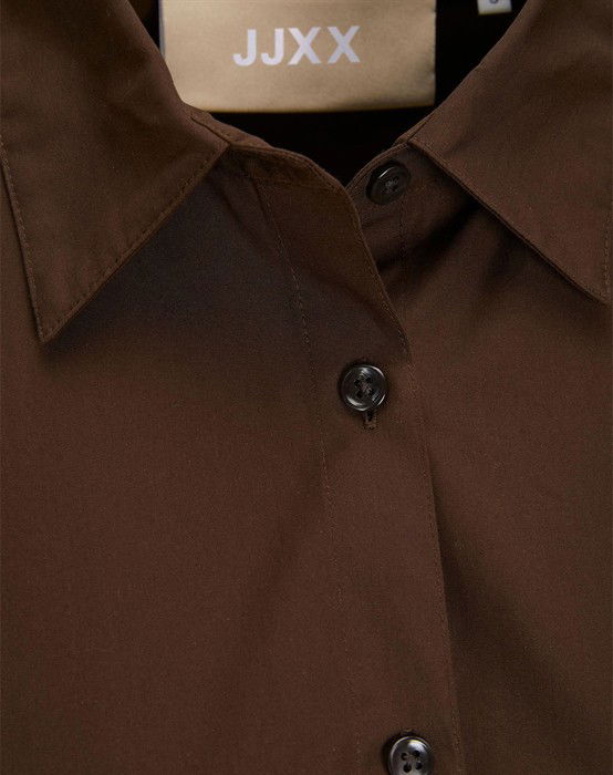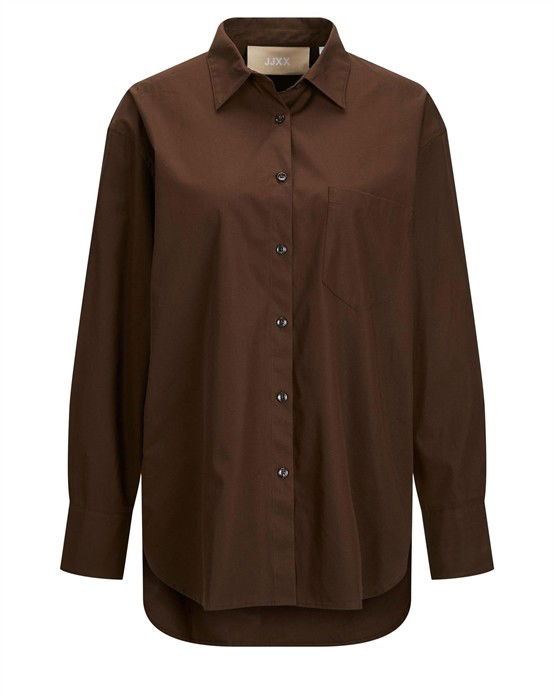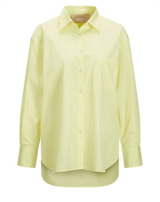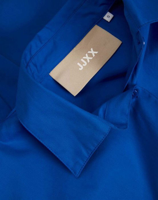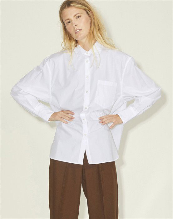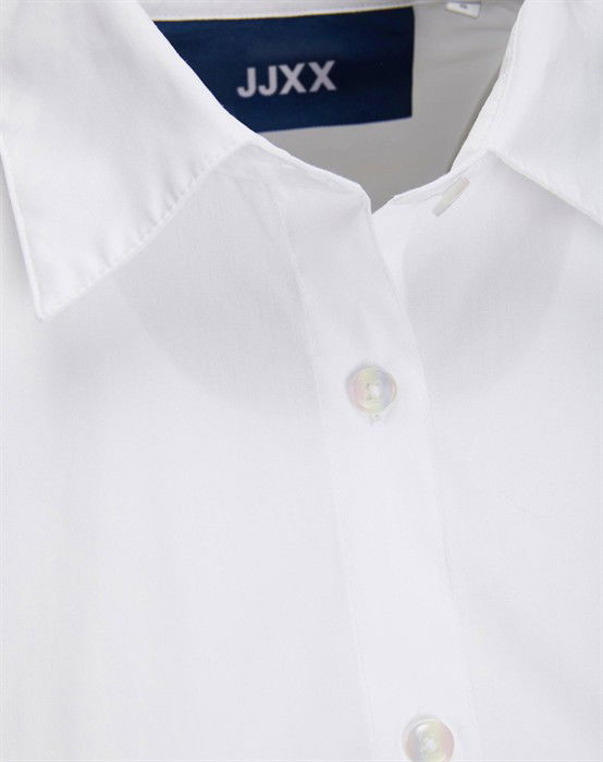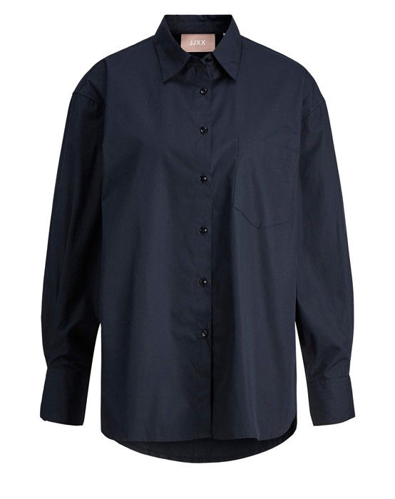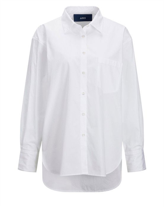 Lækker basic skjorte fra den lækre brand JJXX. Skjorten er lavet i en lækker bomuldskvalitet, der gør den super skøn at bære dagen lang. Skjorten er designet med en klassisk skjortekrave, knappelukning, lomme på brystet samt lange ærmer og en smule længere bagpå end foran. Skjorten har en løs pasform og drop-down skuldre, der giver en cool og afslappet pasform. Derudover har skjorten en lille fin detalje, den har et lille broderet logo under lommen foran.