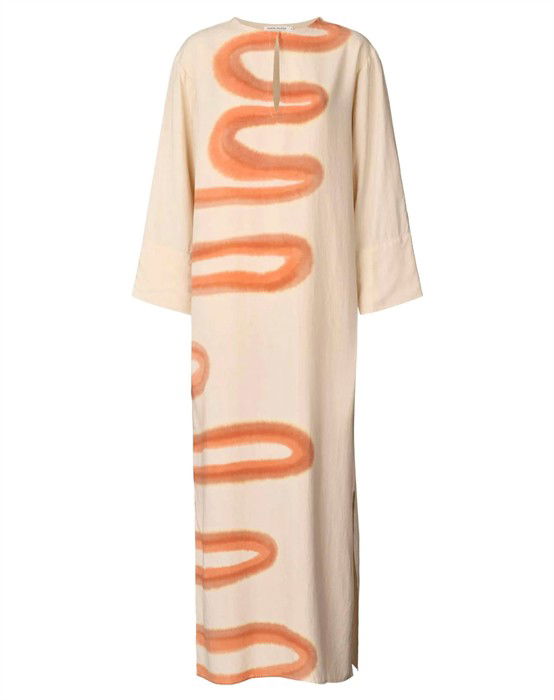 Karimalou Fluid Kaftan Kjole - Rabens SalonerSmuk og elegant kjole fra Rabens SalonerLange voluminøse ærmerRund halsudskæring med et udsnit foran, lukkes med en enkelt knapSlidser i siderneMaxi-længdeKjolen er designet til at have en oversized pasform. Den sidder løst og falder afslappet og hælder til den store side i størrelsen. Svinger du mellem to størrelser, vil vi derfor anbefale den mindste. Modellen er 175 cm og bærer en small.Med Karimalou Fluid Kaftan Kjolen fra Rabens Saloner får du en unik og eksklusiv kjole i den fineste farvekombination. Kjolen har et luksuriøst og afslappet look med en løs og oversized pasform. Den er designet i en maxi-længde med slidser i siderne, der sikrer fri bevægelighed. Derudover har kjolen er smuk og flatterende pasform, der falder smukt grundet det lidt tungere materiale. De lange voluminøse og løstsiddende ærmer samt den smukke feminine udskæring ved brystet giver kjolen kant.Det smukke tie-dye print "fluid" er håndmalet lok