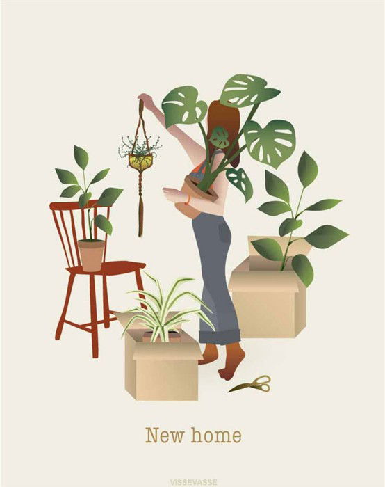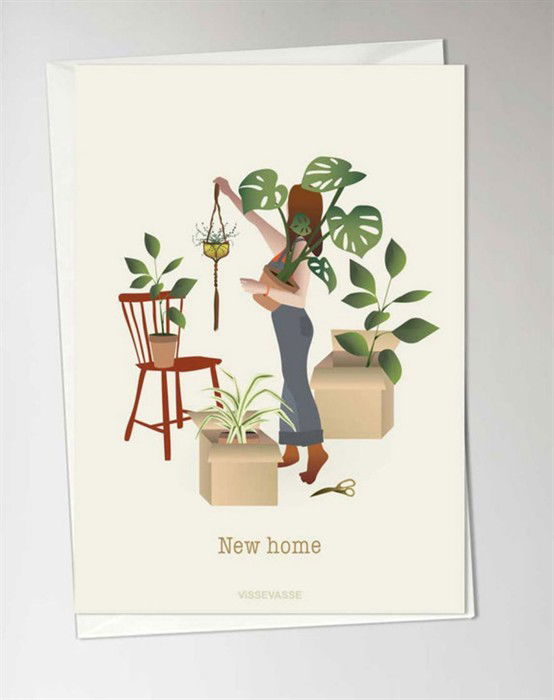 Kort - New Home - ViSSEVASSE Nyt, fint kort fra ViSSEVASSE som et A6 dobbeltkort, der måler 10,5 x 15 cm. Der er god plads til tekst, og der medfølger en konvolut til kortet. På dette kort ses en kvinde, der er ved at pakke planter og ting ud af kasser. Kortet er perfekt til, når du skal give en flytte-gave til din veninde eller et familiemedlem. Kortet er FSC® certificeret. Se alle de fine kort fra ViSSEVASSE her.