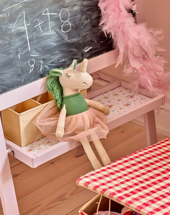 Denne søde enhjørning-bamse hører til Rice Kids' magiske univers. Oplev mange nuttede bamser, som denne. Enhjørningen er i en blød kvalitet, som både kan krammes i sengen og leges med på gulvtæppet. Slip fantasien løs med bamsen med det lyserøde balletskørt, grønne manke og fine detaljer i guld.