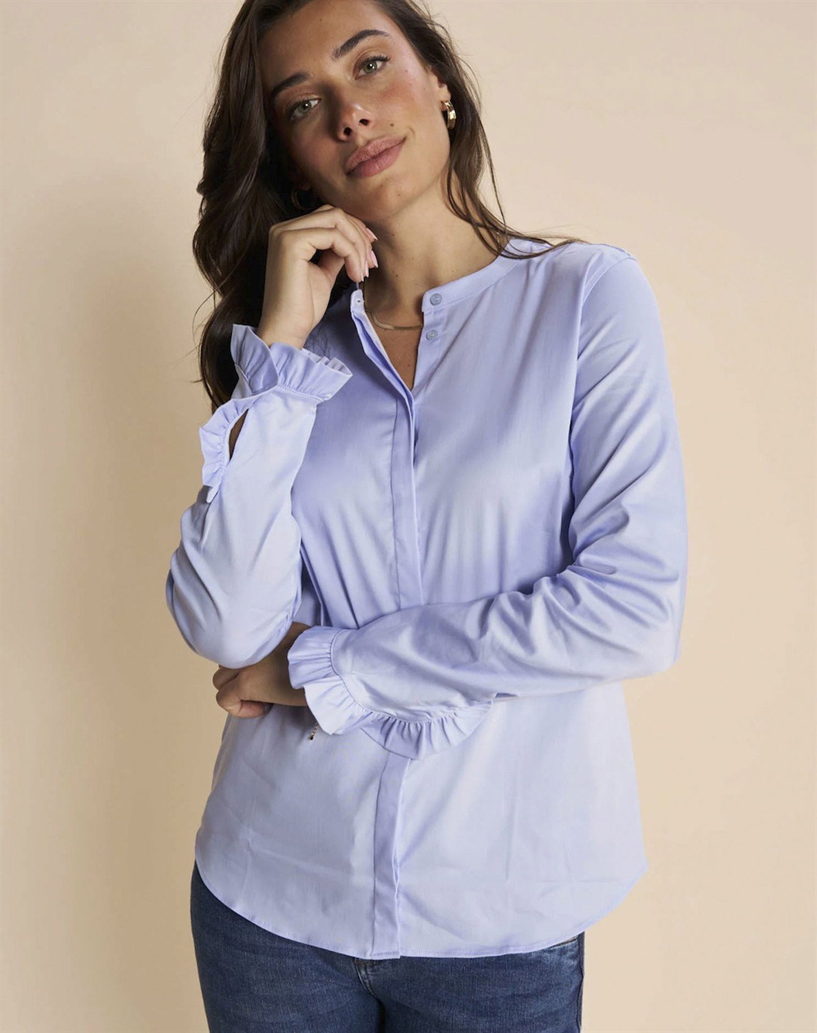 Denne smarte og feminine skjorte fra Mos Mosh damekollektion er perfekt til dig, der elsker at kombinere et klassisk look med et feminint strejf. Denne lækre skjorte i blød poplin kvalitet har smart kinakrave i halsen og flæser i ærmekanterne - begge dele detaljer, der gør skjorten både spændende og feminin. Så elsker du stilrent og klassiske designs på pigeskjorter, men helst vil undgå et decideret herrelook, så er Mattie skjorte fra Mos mosh dame lige noget for dig. Skjorten er samtidig blød og fleksibel, så den er rar at bære.