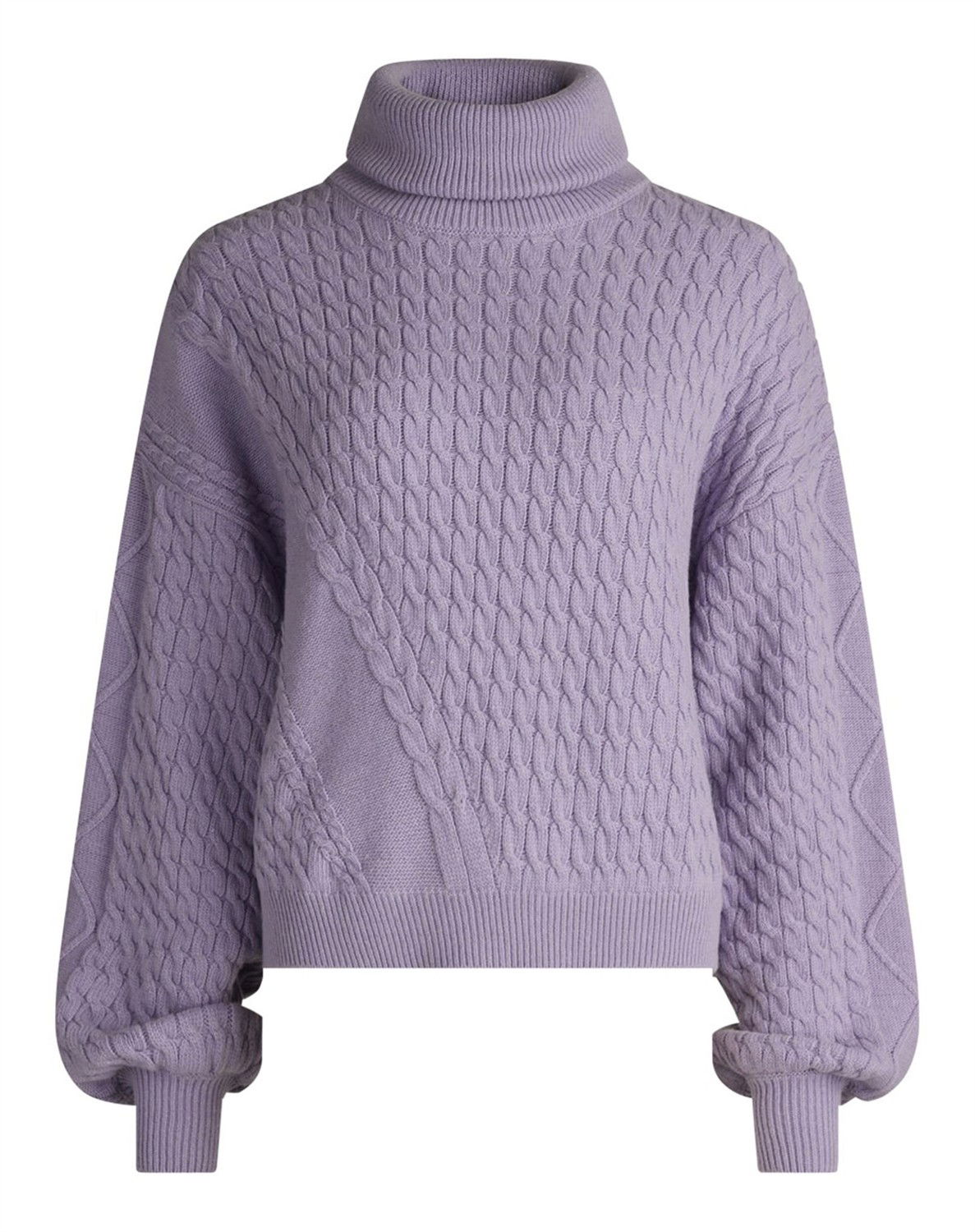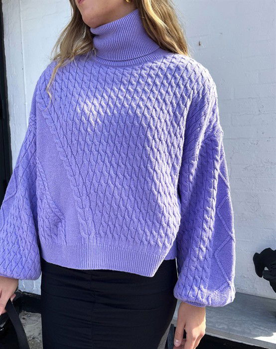Skøn lilla strik fra Mads Nørgaard. Strikken er designet med høj hals og lange ærmer med puf effekt nederst. Materialet er i et flot kabelmønster, som giver et cool look. Pasformen er dejlig løs.